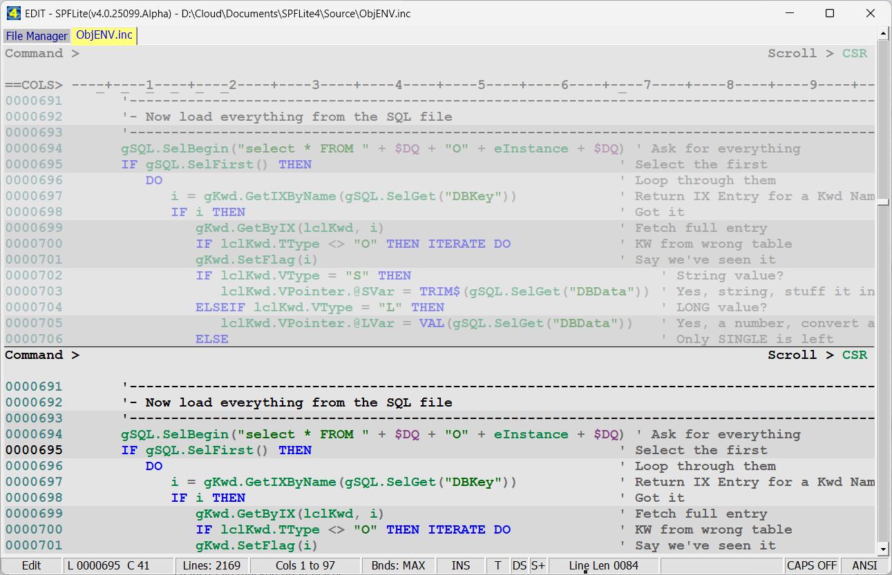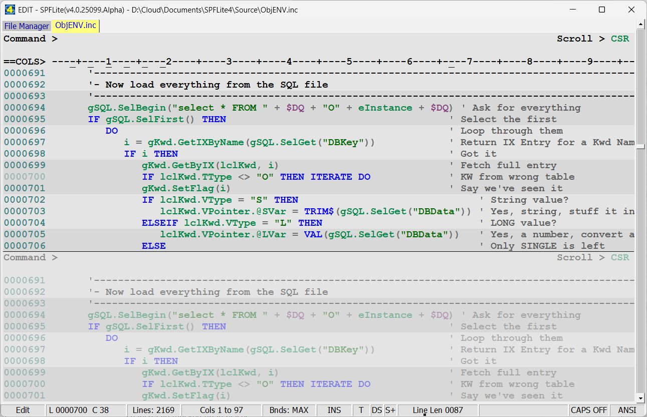 - SPFLite now has a screen mode we call PANEL mode. In this mode the screen is split horizontally or vertically into two ‘panels’. Each panel looks just like a normal SPFLite window, only smaller.