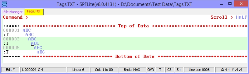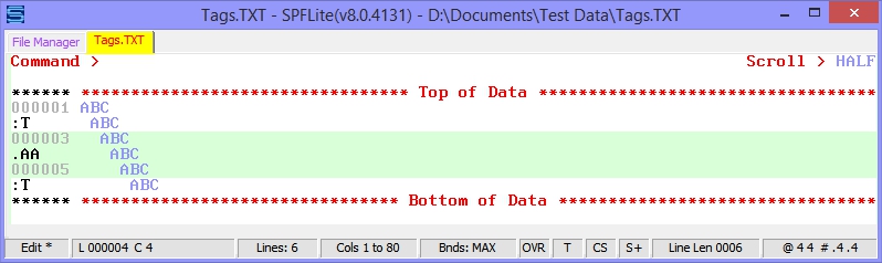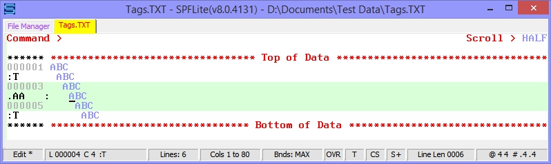 Let's say we have the following file, and we manually entered a tag name of :T on lines 2, 4 and 6, and then on line 4, then we also entered a label of .AA The file display will look like this: