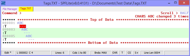 Let's say we have the following file, and manually entered a tag name of :T on the lines shown, and then issue a CHANGE command that uses those lines: