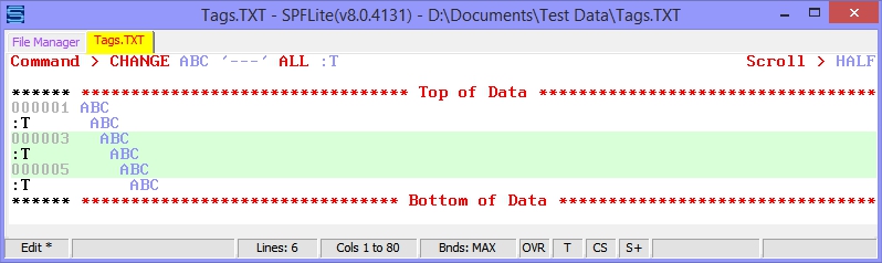Now, if you were to enter a TAG command that looks like TAG :T 'string' :T, it's asking the editor to select lines already tagged with :T that have 'string' on them, and then tag them with :T again. That won't do what we want here.