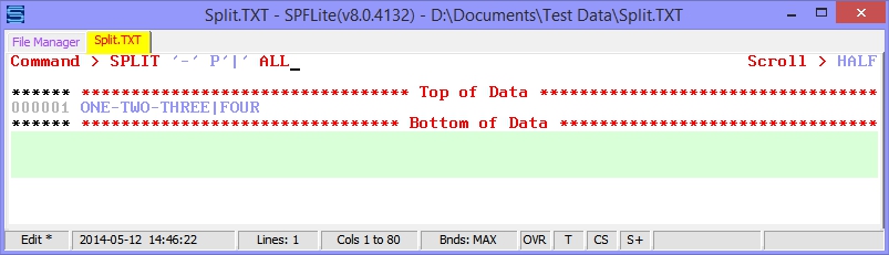 Split a line on dashes, which are then discarded. Note that a literal | vertical bar in the data does not cause line splits, and is not confused in the SPLIT operation. You can also specify the command as SPLIT '-' F'|' ALL.