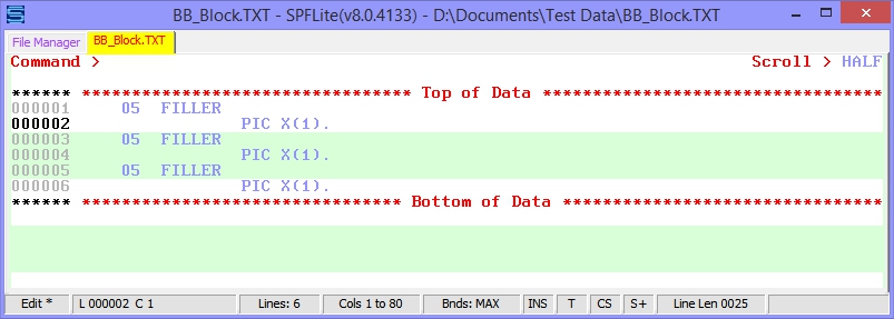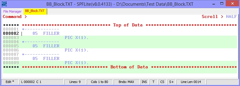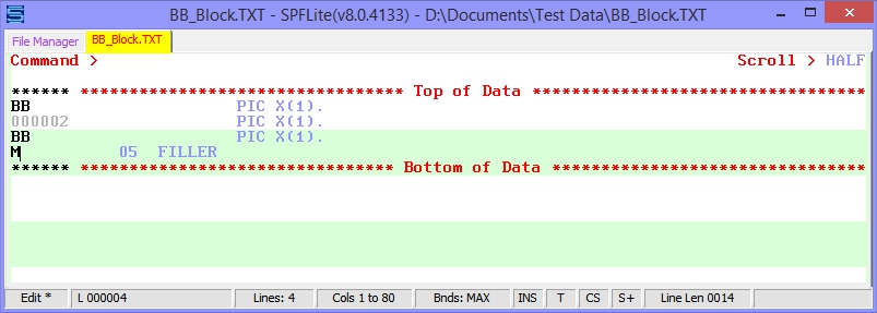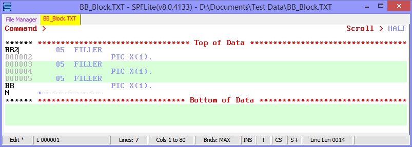 The BB block command is used to copy or insert before every line in a block of lines. If a line or group of lines is to be inserted after (or before) every line in a range of lines, standard ISPF requires the inserted data to be manually placed by individual copy and A (or B) line commands. SPFLite will allow definition of a BB block, and then insertion of data will occur before every line in that block.